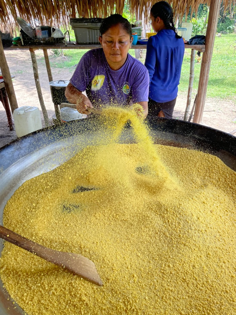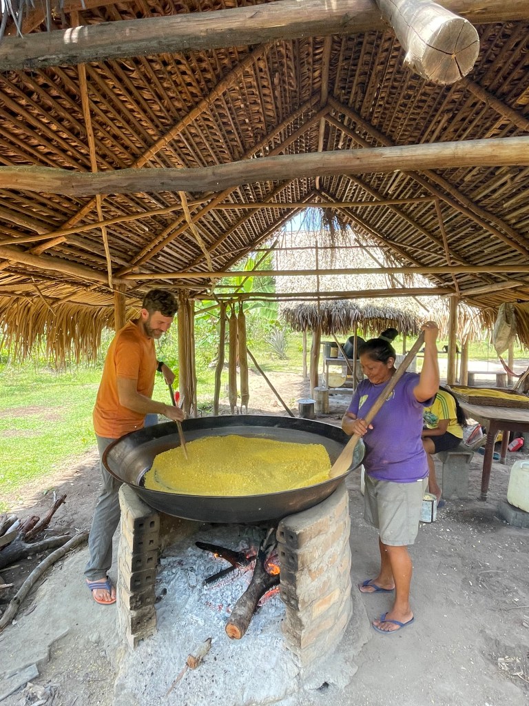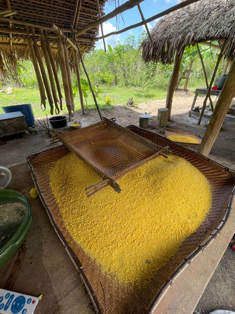 We were collected from the junction by Bertrand, one of the senior councillors, we drove along through the jungle road, past rivers and marshes (I spotted a caiman!), through the pretty village and then eventually we got to the lodge, which is quite out on it’s own and very quiet with views over to the mountains. Lisa helped us settle in and showed us our little room which was just perfect – we had a room in the dormitory house rather than one of the more expensive benabs (traditional houses) which to be honest suited us as its so private there and quiet. The lodge is amazing value for money and the staff and elders are super friendly, they really take time to tell you about their life there and we felt like one of the family! You can see why they are proud of their way of life and you can feel that they have such a strong identity and culture. The food is cooked with immense love and dedication by Angela and Lisa who described the process for making some of the delicious dishes on offer. For example ferrine, which is made from cassava and looks a little bit like cous cous takes several days to prepare – see my post about Amerindian Guyanese and Guyanese food here!