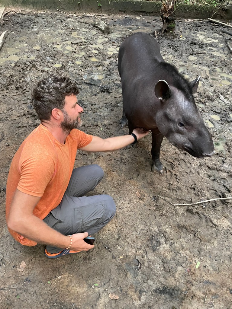 The following day Lionel took us to spot the cock of the rock! We were in luck! We trekked to a series of huge boulders – don’t forget this area is part of the guinean ring where the geology is some of the oldest on earth – this was the territory of several cocks of the rock! Lionel pointed out a nesting female hidden expertly under one of the huge boulders, she is much darker and plainer than her male counterpart. She sits in a nest made of mud that looks like it’s been there for years. We then quietly sat in wait for the male to show up. Whilst waiting we spotted come beautiful nun-birds with red beaks. Then the cock of the rock suddenly appeared with a flourish! Wow! He went from branch to brach, showing off to us, we were in awe! Such a vibrant reddish orange plumage and unusual appearance – our first bird of paradise! At one point he even flew down onto his personal courtship area – a patch on the jungle floor he keeps clean and tidy where he will show off to females in the hope of finding a mate. He didn’t try and court us but it was amazing to be in his territory whilst feeling that we were not intimidating him. We kept our distance and remained totally silent, always avoiding any sudden movements. On the trek back we also spotted a tortoise, more macaws, six grey-winged trumpeters, agouti, capuchin monkey and two more female cocks of the rock! We also spotted a tyra from our verandah today!!